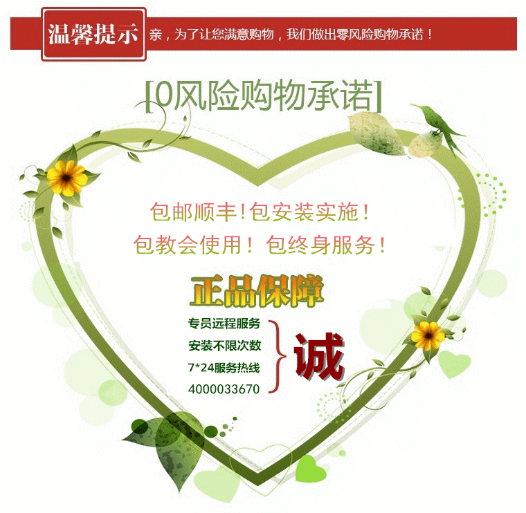 放心承諾: 專員負(fù)責(zé)遠(yuǎn)程協(xié)助+24小時(shí)400免費(fèi)服務(wù)熱線+終身服務(wù)。本店承諾實(shí)行四包:包郵順豐!包安裝實(shí)施!包教會(huì)使用!包終身服務(wù)!徹底讓親無(wú)后顧之憂。