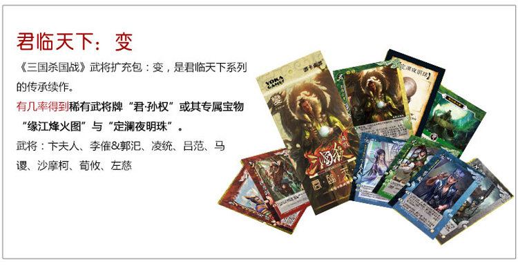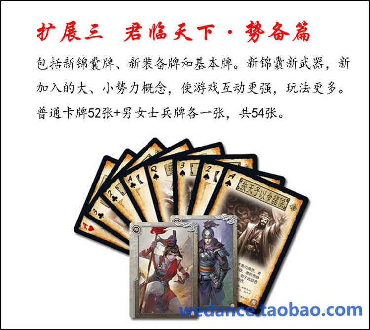 《三國殺·國戰(zhàn)》擴充包《君臨天下》系列的第三部作品,卡牌擴充很不錯;每包內(nèi)含52張游戲牌;要須加入《三國殺·國戰(zhàn)》進行游戲,每包贈送《三國殺》武將閃卡1張;卡牌采用300g中華黑芯