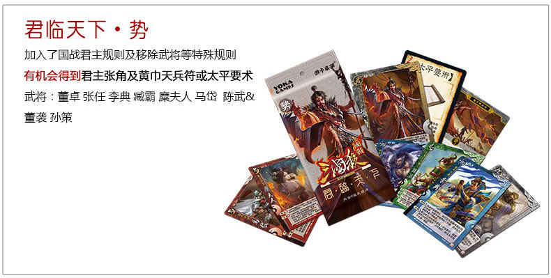 《三國殺·國戰(zhàn)》擴充包《君臨天下》系列的第二部作品,武將擴充第二;每包內(nèi)含8張武將牌;并可隨機獲得君主張角及黃巾天兵符,或太平要術;須加入《三國殺·國戰(zhàn)》進行游戲,每包贈送《三國殺》武將閃卡1張;