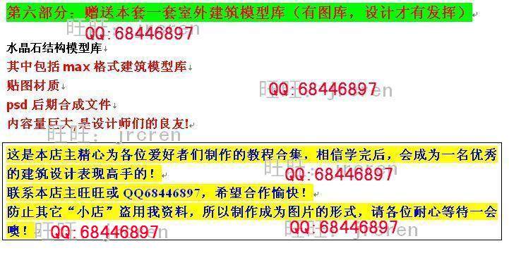 4.本套教程含有高速效果圖制作技術(shù),CAD平面圖+三維模型很少性出圖,具體方法可向店主咨詢(秘籍哦)