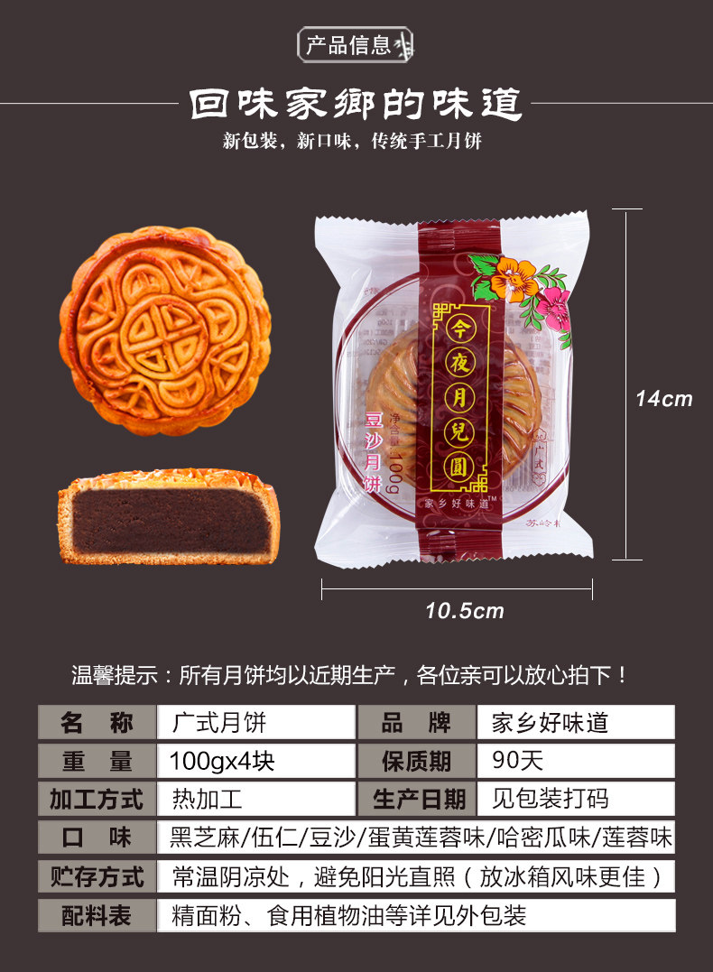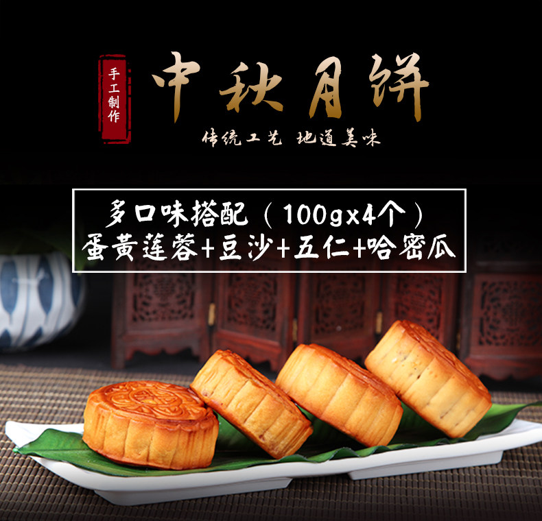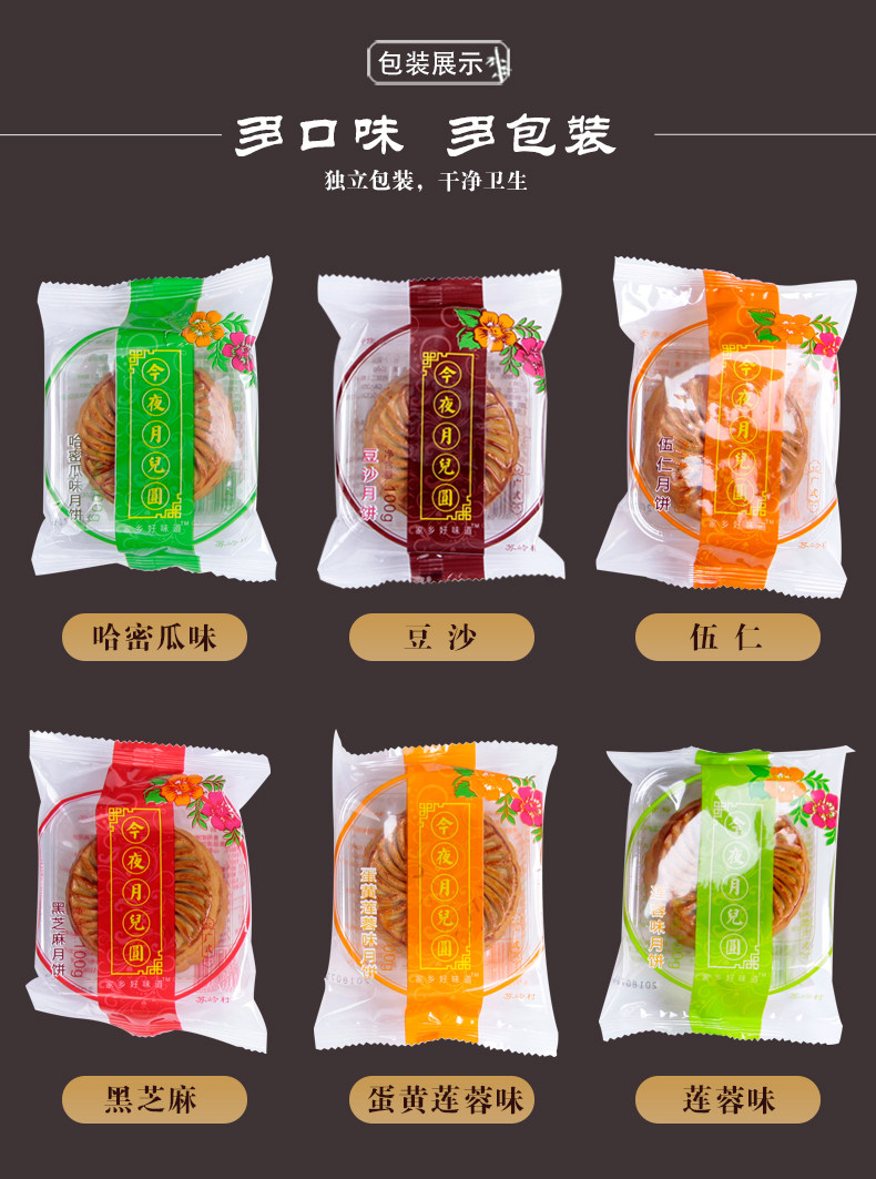 - 月餅餡種類:蛋黃蓮蓉100gx3個(gè)豆沙味100gx4個(gè)五仁味100gx4個(gè)哈密瓜100gx4個(gè)芝麻味100gx4個(gè)蓮蓉味100gx4個(gè)多口味100gx4只